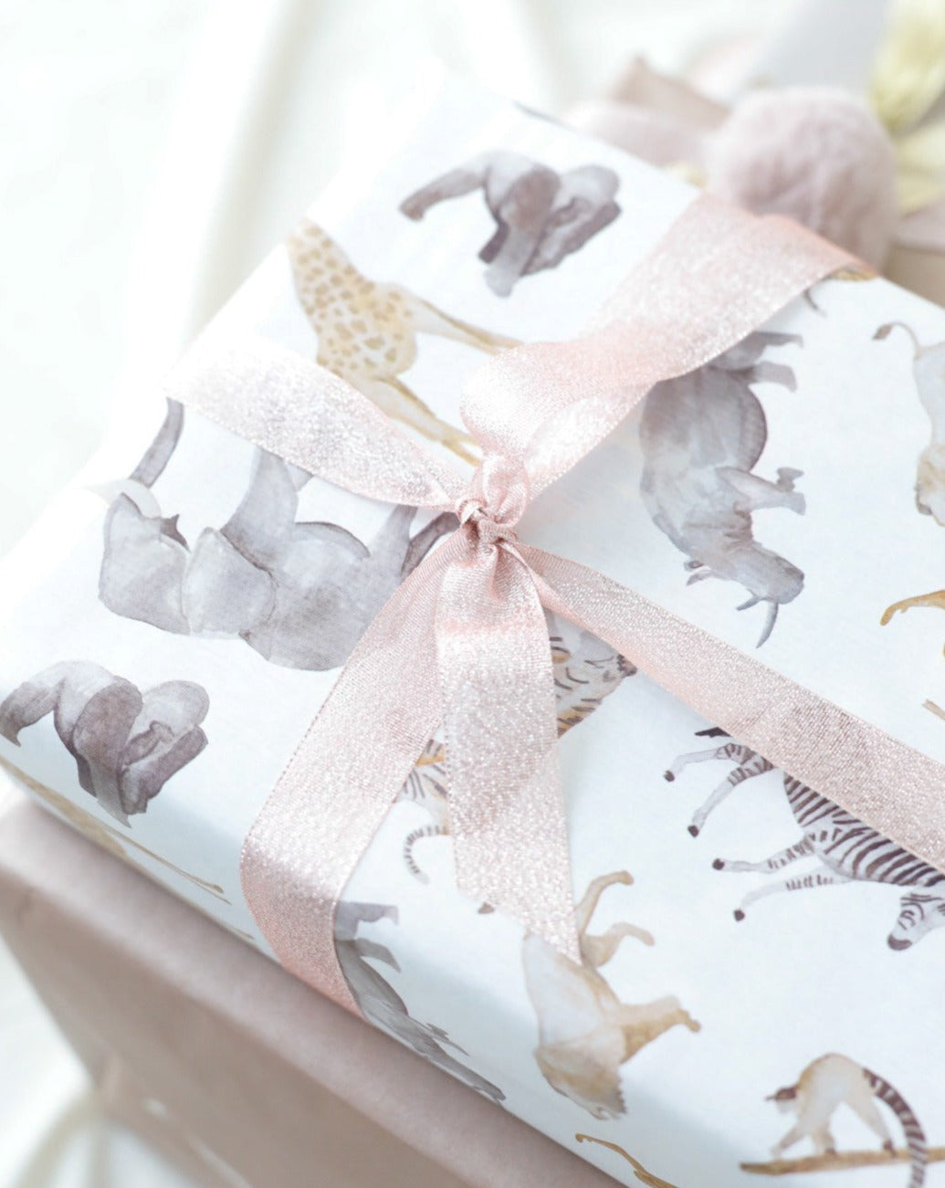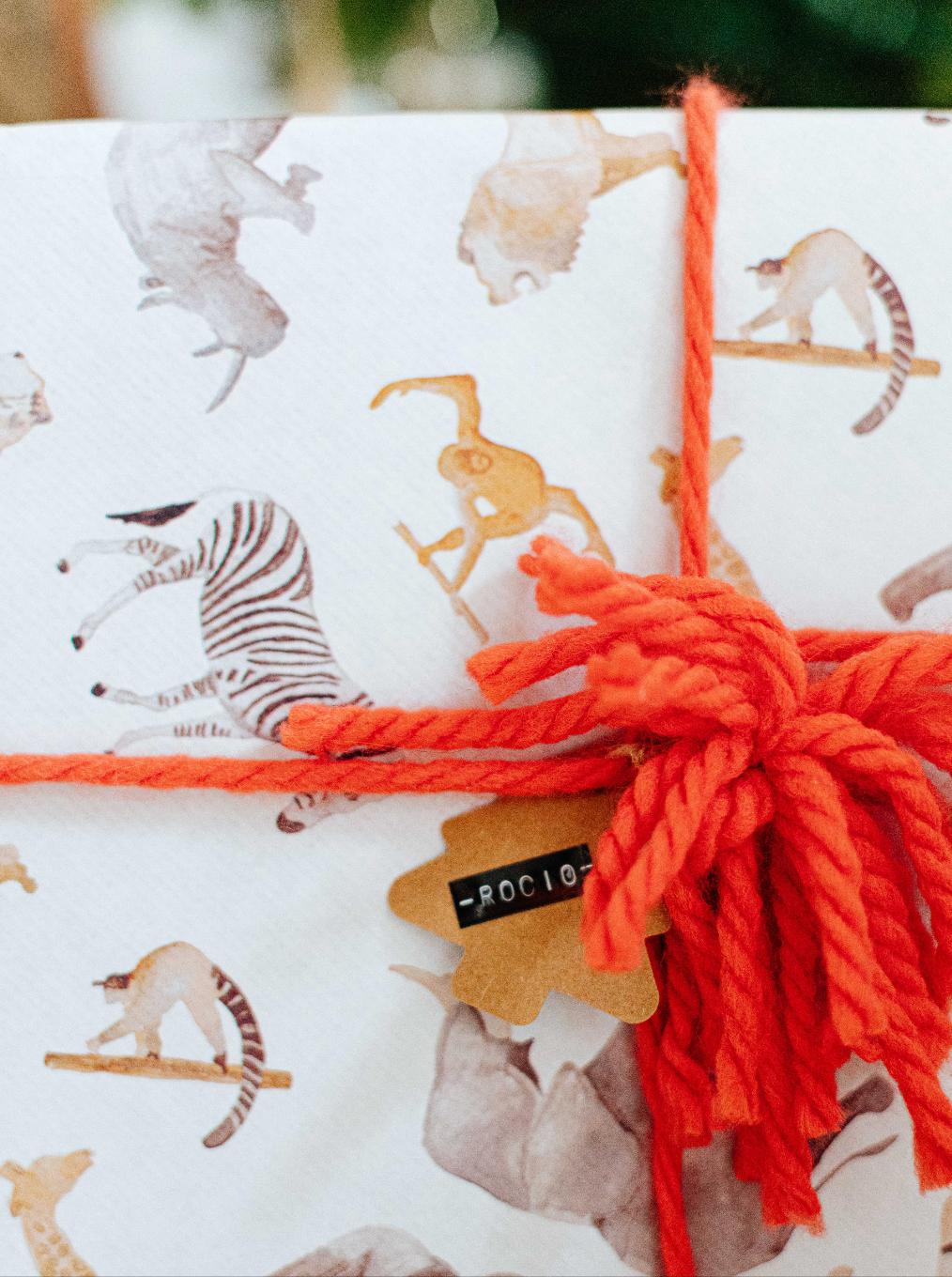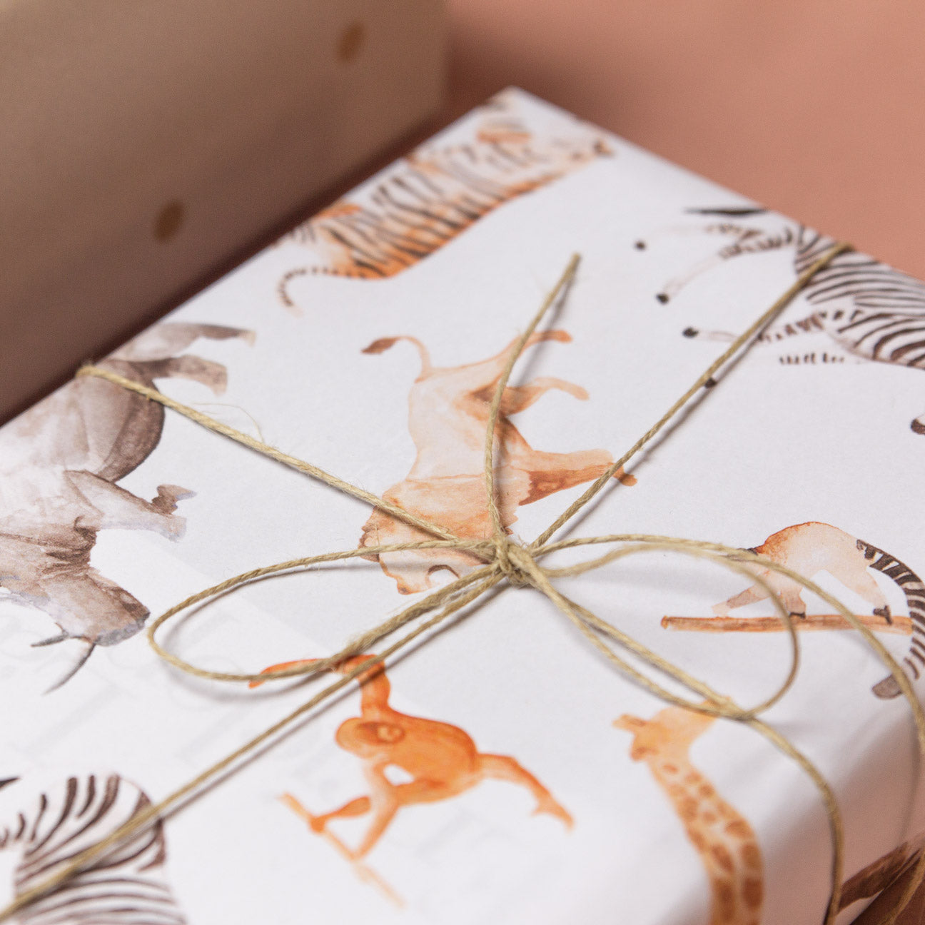Hemos pintado a mano con acuarela a nuestros amigos para dar vida a este papel de regalo. Un elefante, una jirafa, una cebra, un rinoceronte, un tigre, un gorila, un lemur, un león y un orangután serán los protas de la fiesta.
