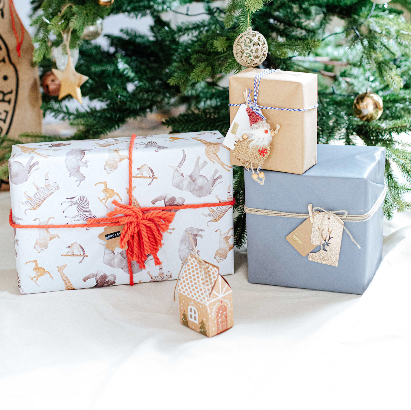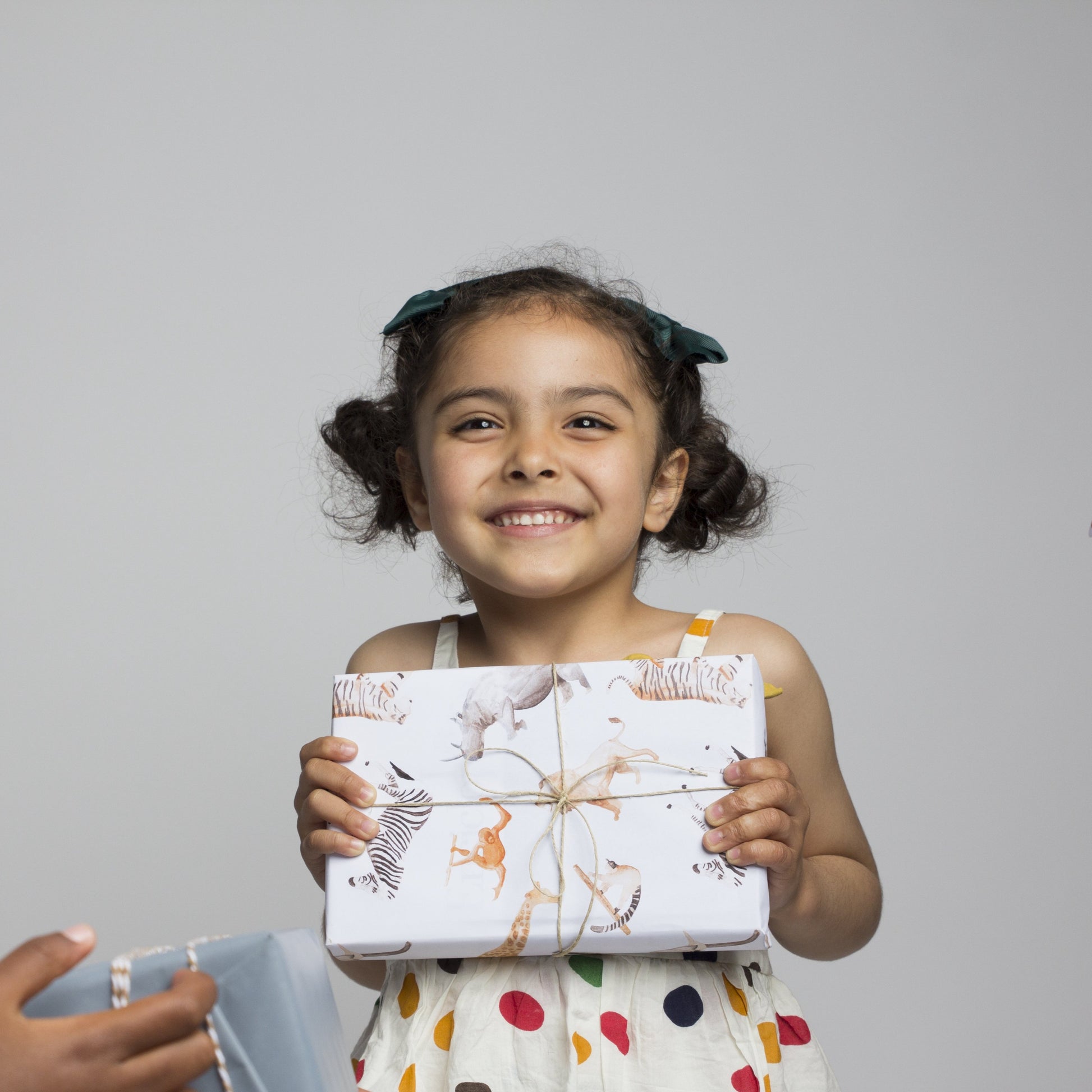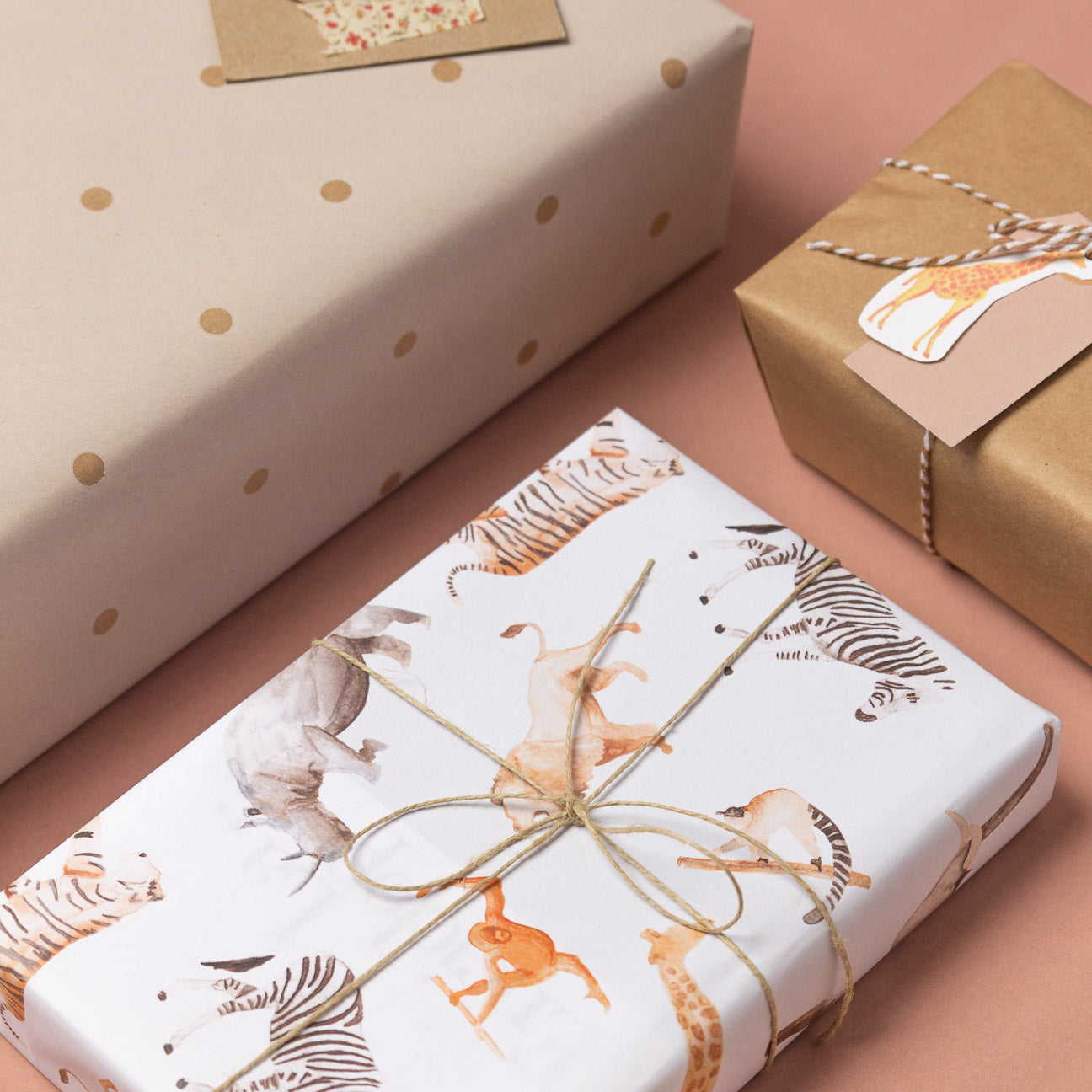 Hemos pintado a mano con acuarela a nuestros amigos para dar vida a este papel de regalo. Un elefante, una jirafa, una cebra, un rinoceronte, un tigre, un gorila, un lemur, un león y un orangután serán los protas de la fiesta.