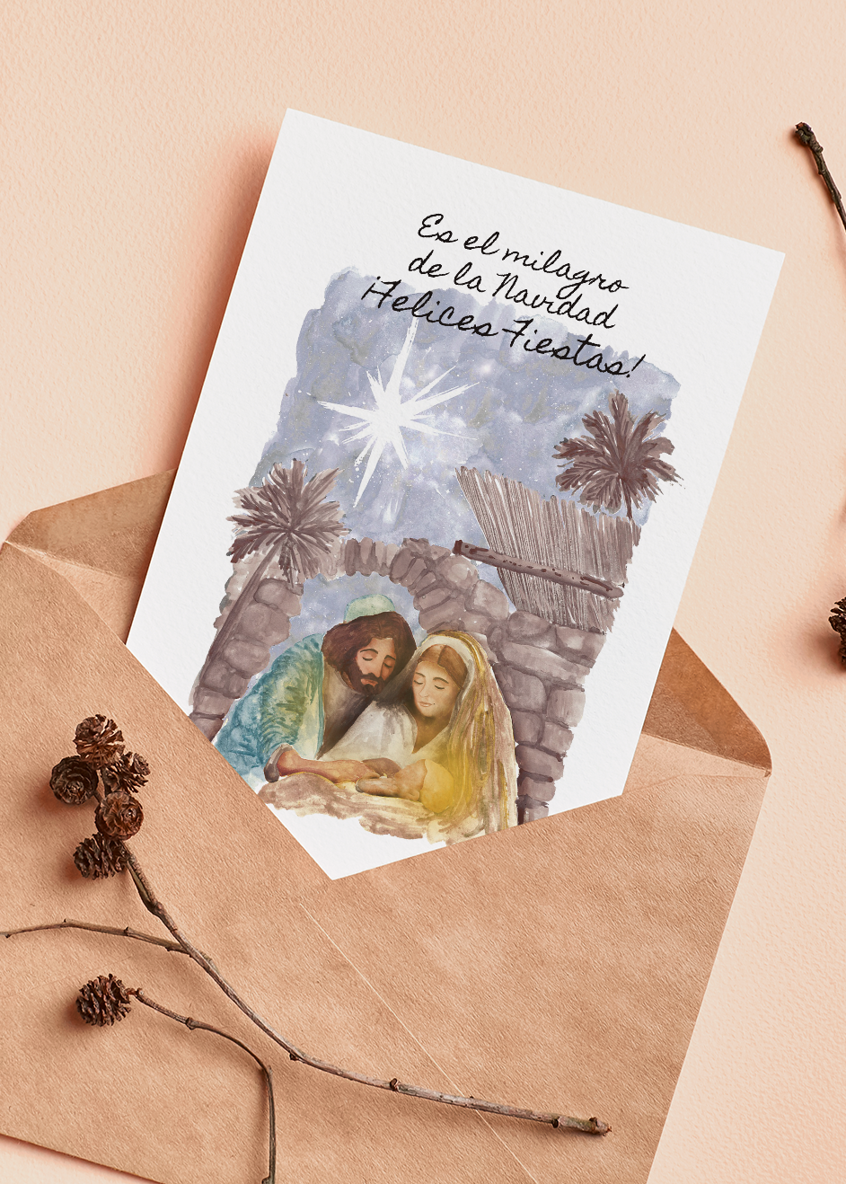 Con su mensaje “Es el milagro de la Navidad. ¡Felices fiestas!”, esta postal cristiana de Navidad une el sentido más profundo de la celebración con el deseo alegre de compartirla con quienes más quieres.