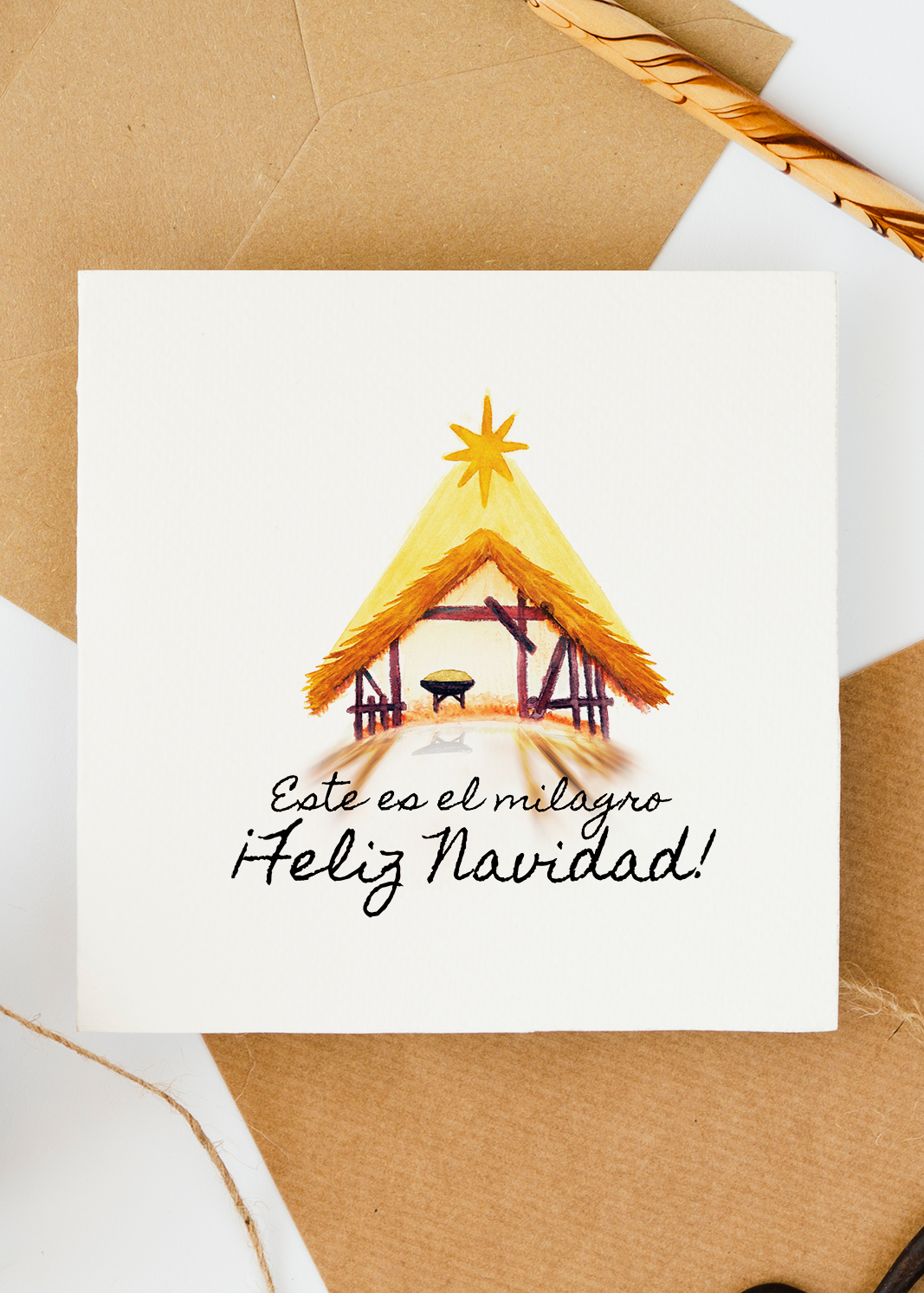 Con su ilustración del pesebre y el mensaje “¡Feliz Navidad!”, es perfecta para acompañar tus regalos, enviar buenos deseos o conservarla como recordatorio del verdadero sentido de estas fechas.