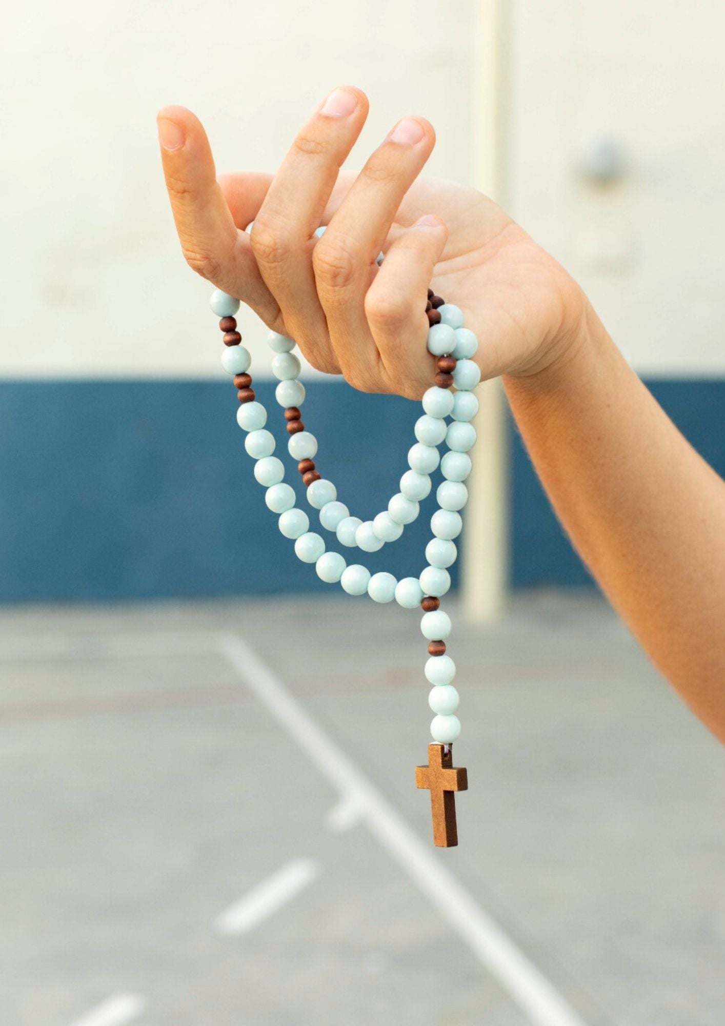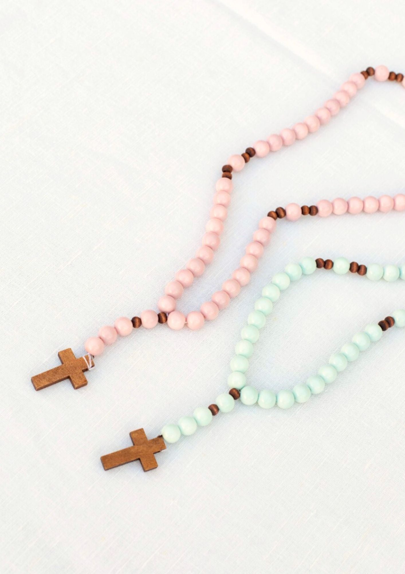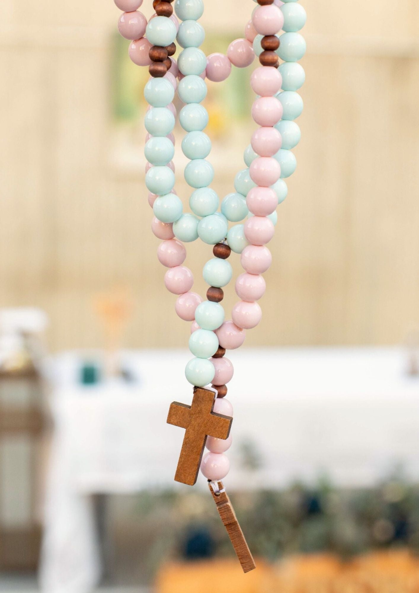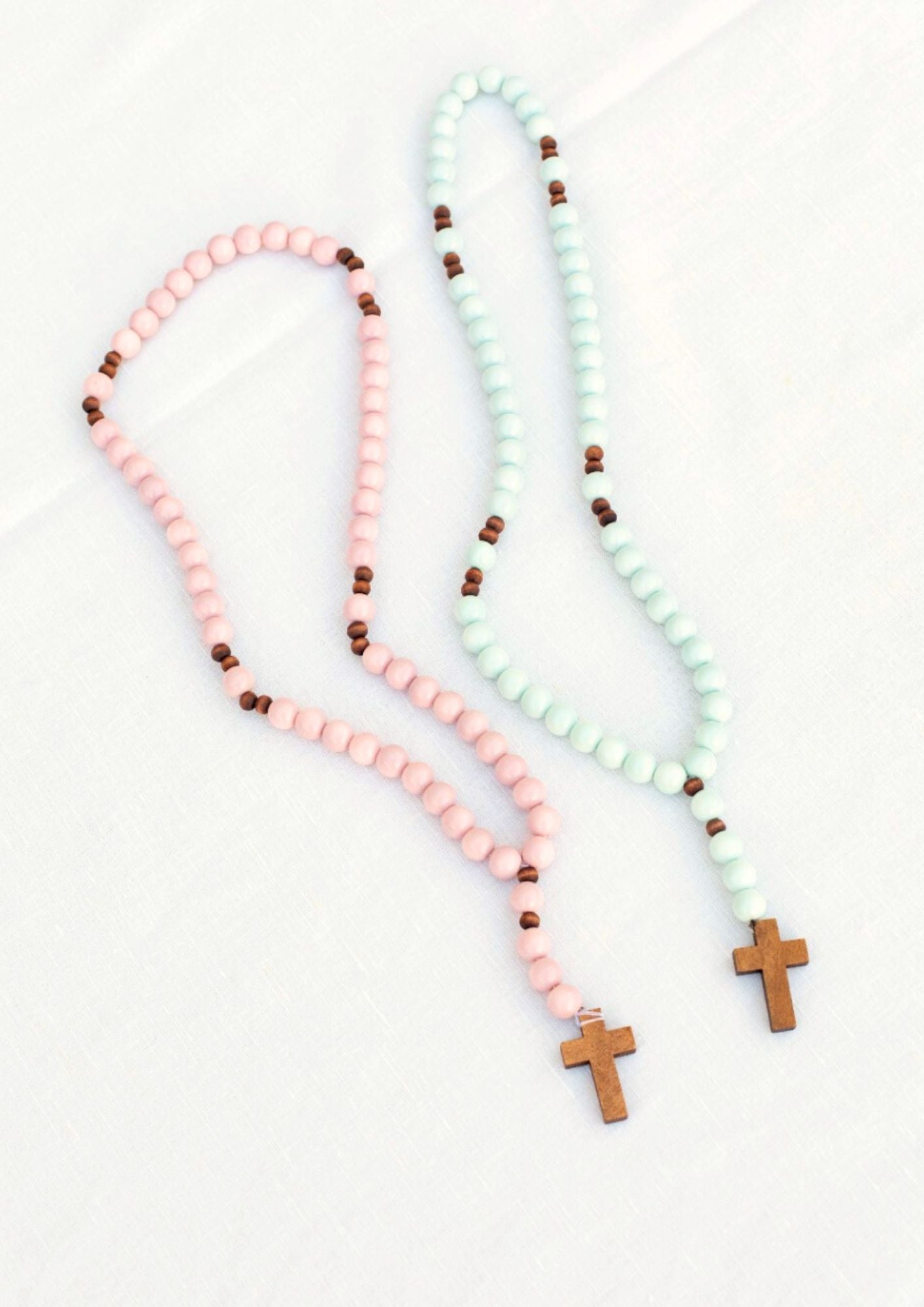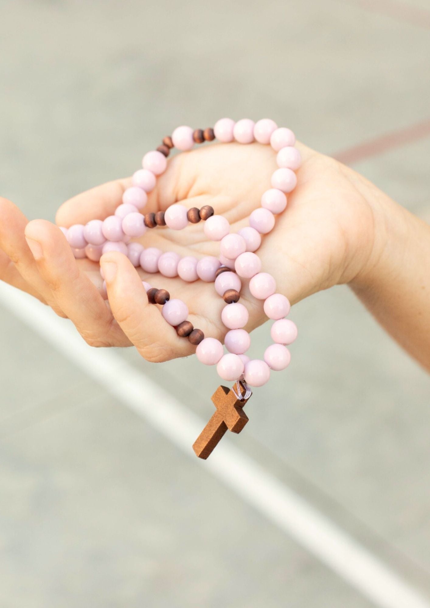 Rosario hecho a mano con resina y madera. No pesa nada.